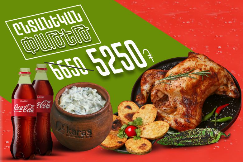 Chicken grill, 1 pepper, 2 portions potatoes "plech" + gift sained yogurt salad, two 0.5 l of coca cola․