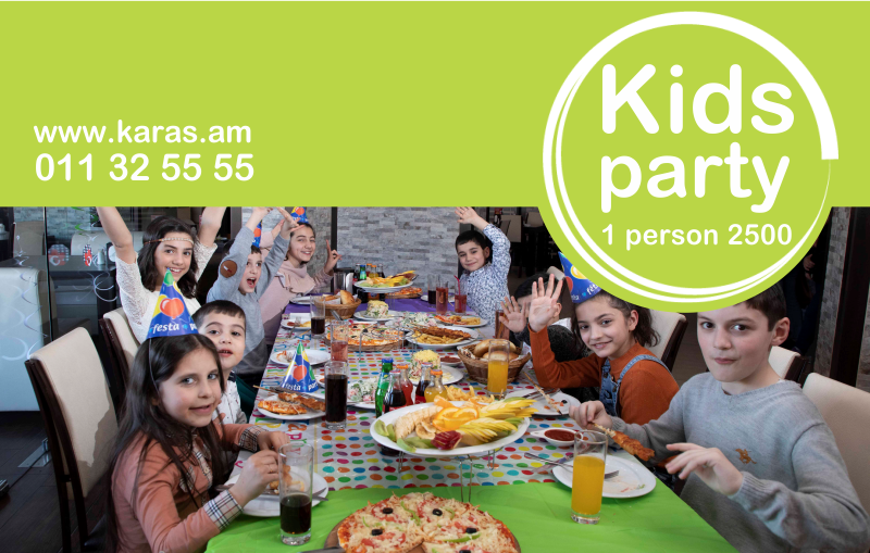 <p><strong>Karas prepared a holiday offer </strong><br>* Thematic design<br>* Variety of dishes<br>* Bright and colorful event<br><br>The cost per person is 2500 AMD.<br>* This special offer is available in Karas shopping center Yerevan Mall.<br>Package includes:<br>2 big pizzas (Palermo and Chick Marley)<br>5 chicken pieces on sticks<br>1 portion of karas salad<br>1 portion of Grandma's salad<br>5 portions of french fries<br>1 portion of bread<br>5 bottles of cola / fantasy or compote<br><br>We also prepared a GIFT. We will provide a 5,000 AMD gift card for every 5th children. For registration and other details, please call 091 244 248.</p>